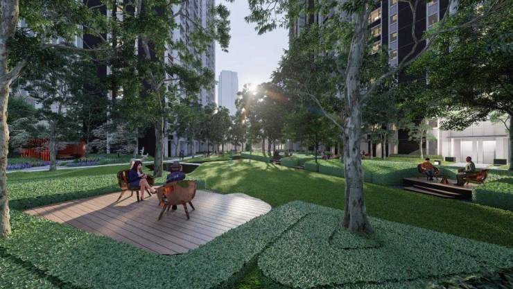 项目绿化率约为35%,融汇“大自然编织”理念,入口庭院、叠水、朴树林、雾色之河、特色山丘、林荫步道等特色景观,注重强调环境功能的实用性以及居住者的互动体验。