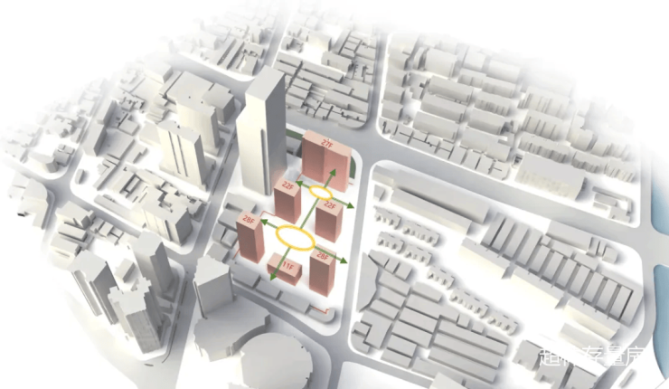 居住区的整体规划遵循对称规整的礼序布局,采用了核心十字轴+两大礼仪花园的规划结构,开放式架空中庭与轴心交汇的全方位景观模块,打造一个自然与技术结合、都市新生与里弄叙事融汇的海派邻里社区。