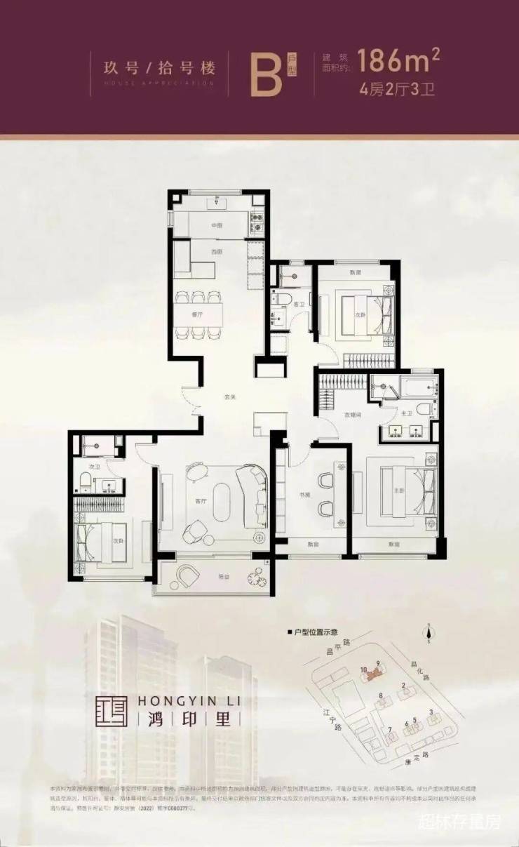面积约186平,4房2厅3卫;
