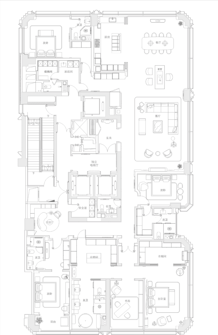 约600㎡户型是6房带4套房,完整满足了居住在平层的所有功能空间需求。