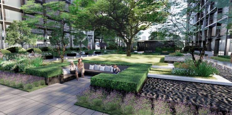 庭院里有亭亭如盖的大树,草坪里有下沉式的阳光卡座,大玻璃立面围合的会客厅,隐身在绿意葱茏的丛林中,像极了东京大手町的安缦酒店。