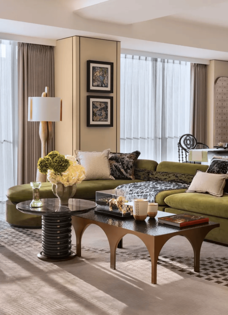 草绿色的沙发勾勒出大草原的意境,品牌茶几和玄关的桌子呼应。优雅的地毯勾勒出会客厅的核心区域,不同的座椅增加对话场景。海派的融合力量下,丰富的艺术元素巧妙衔接,丰富的细节彰显奢华。多元化的设计主题下,增加社交和品鉴的场景。