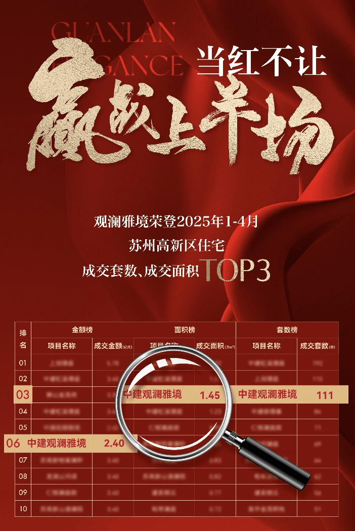 2025年1-4月,中建·观澜雅境111套成交套数、约1.45万㎡成交面积,荣耀跻身区域前三甲,用人气与热度引爆苏州楼市。这份亮眼成绩的背后,不仅是改善圈层对项目产品力的高度认可,更是对太湖科学城未来价值潜力的笃定与期许。