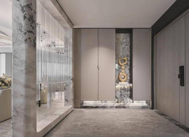 户型格局上,基本做成了类一梯一户格局,一层两户两部电梯,彼此都拥有独立的入户门厅。进门是大空间玄关区,与之搭配的辅料,有皮革、山水纹理大理石、瓦楞玻璃、仿古铜金属等,时而明澈,时而苍劲。米白色石材和温润的木质面犹如一个盛在东方意蕴的艺术品。