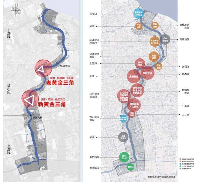 2035年“一江一河”战略明确,黄浦江沿岸将形成两大黄金三角:
