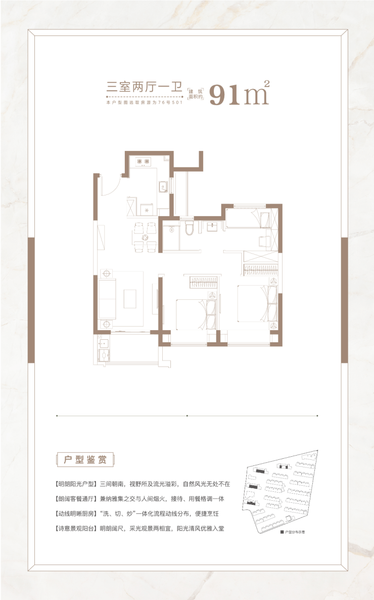 建面约91㎡三房两厅两卫,三开间朝南+双朝南卧室带飘窗+动静分离+卫生间干湿分离,这样的三房设计,对于上海首套置业购房者来说,非常友好,未来想要做置换,也比较容易出手。