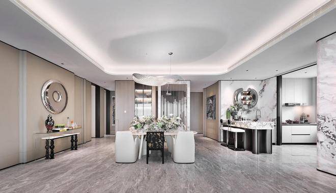 移步餐厅,Visionnaire Previous 餐桌以卡里冰玉大理石点亮空间。冰白色石材中若隐若现的浅灰纹路,如江南烟雨晕染的诗意,与翡丽风格芬迪白大理石墙面形成材质延伸。