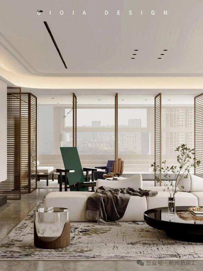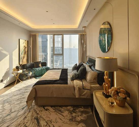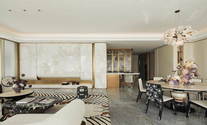 将艺术感进一步融入日常中。特别设计的专属门厅空间,是从电梯厅延伸到家,如同一处艺廊,放慢人的情绪;室内选用了浅金色奢石(外界也称其为“芬迪白大理石”)作为主要的石材,曲面的木饰面也为浅色,整体给人以明亮感。