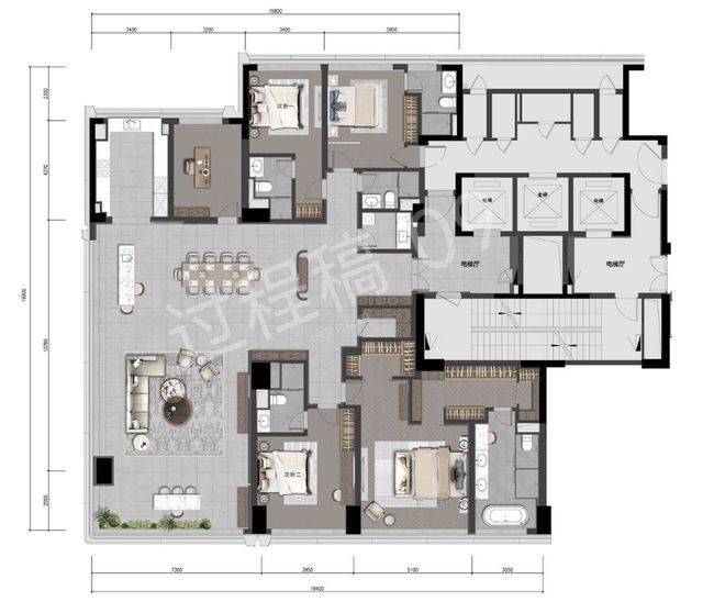 公区方厅第一眼的感觉就是辽阔,建筑面积超90㎡,想举办超大型party都没问题,并且南向开间有约19米,这样的尺度能和市面上四五百方户型的客厅媲美了。