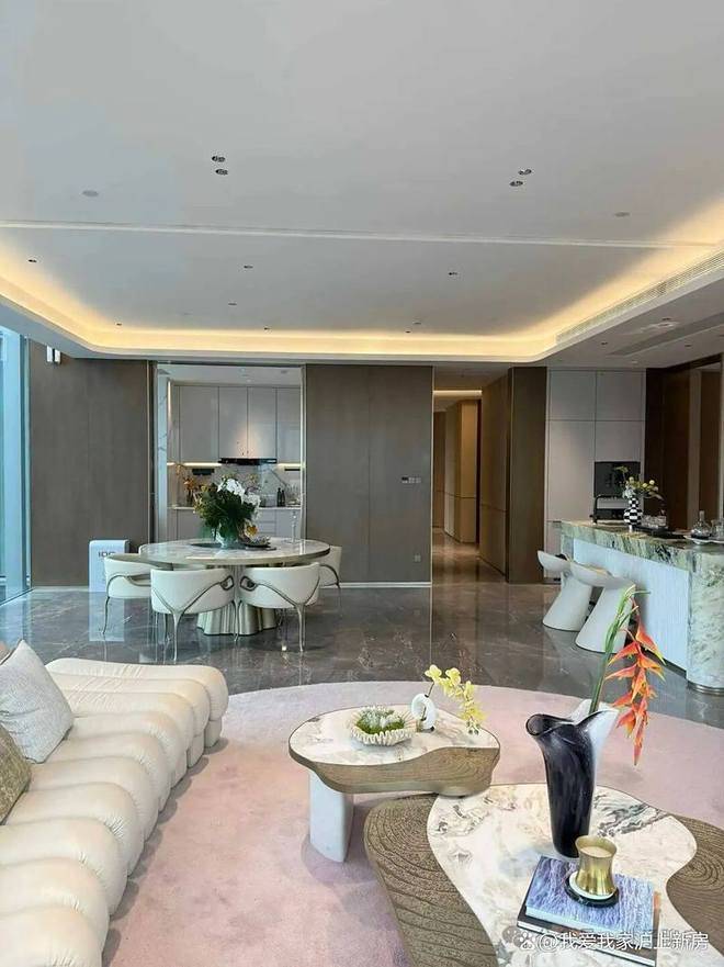 整体设计风格以浅白色为主,客厅背景墙贴着大面积「芬迪白大理石」,弧形的造型配合木饰面,以及酒店级的灯光设计,让整个空间看起来奢华又不失温馨。