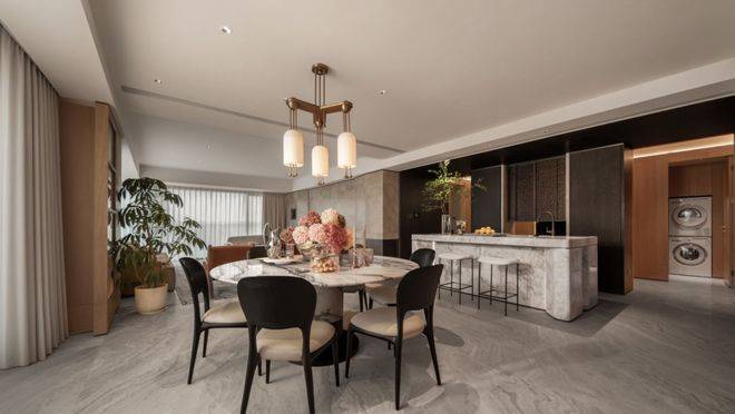 建面约240㎡四房三厅三卫,由国际知名室内设计师吴滨执笔,以厨电、收纳、家政、智能、幕墙、定制“六大满配”,实现了从空间功能、材质美学到身心体验的全维革新: