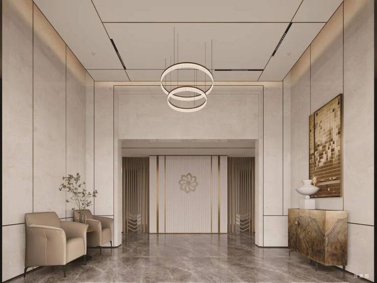 首层入户大堂,石材搭配金属装饰条的地面、墙面,空间宽敞气派,质感十足。