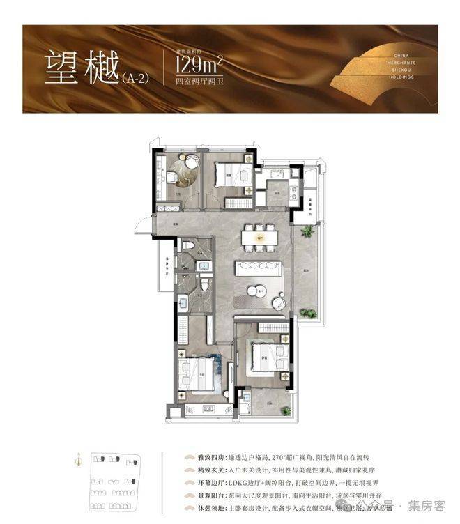 以中间套为例,建面约123㎡的户型做到了主次卧+客厅四开间朝南,伸展开约13.3米的超大面宽,对应双开间阳台与飘窗的设计,进一步提升了全屋的采光。此外,一体化的餐客厅,“一镜到底”活动空间,在视觉上拉大了户型的朗阔尺度。