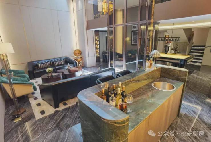 公共区域着重体现宋式园林古朴自然的美学风格。主入口墙面采用亚马逊黑奢石,其色泽深邃,纹理独特,展现出一种沉稳而厚重的质感;对景墙采用亚马逊绿奢石,绿色奢石增添高贵神秘感,引人注目。