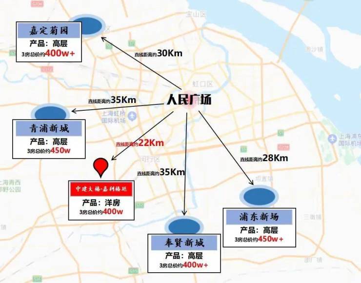 二,当下上海,同样400万级别置业选择中,菊园、罗店、安亭房、奉贤新城、惠南距离人民广场距离都在30公里以上,中建大椿•嘉利椿廷仅24公里,明显更近市区主城。