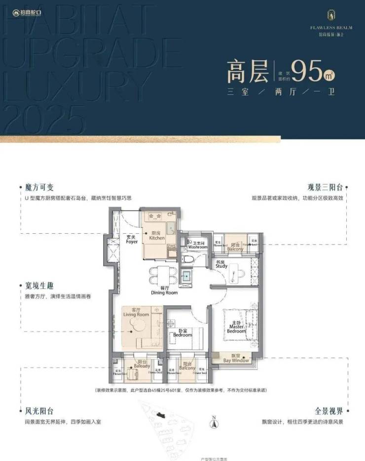 建筑面积约95/105㎡三房,进阶改善绝版“三阳台”户型
