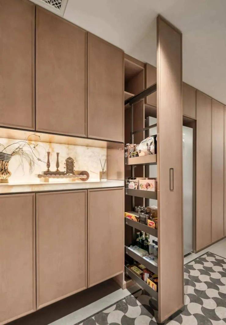 厨房更是堪称美食达人的天堂,集成一系列多功能调味拉篮、定制谷物抽屉等,收纳有序,油盐酱醋间的分类放置烦恼一次性得到解决,琐碎繁杂不再。