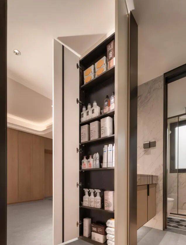 双薄柜设计则大大增加容纳空间,举例来讲,可容纳约200包纸巾,足以满足全家1年使用。而洞洞板设计,则可收纳清洁工具、长柄伞等大件日常用品,如此贴心布局,保证室内物品足够井然有序,也更为利于家庭日常打扫。