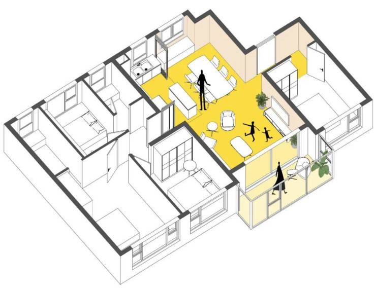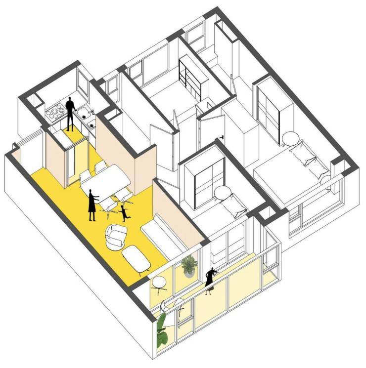 客厅空间融入宽景阳台后,创造出更加互动、开放、可变的融合空间;