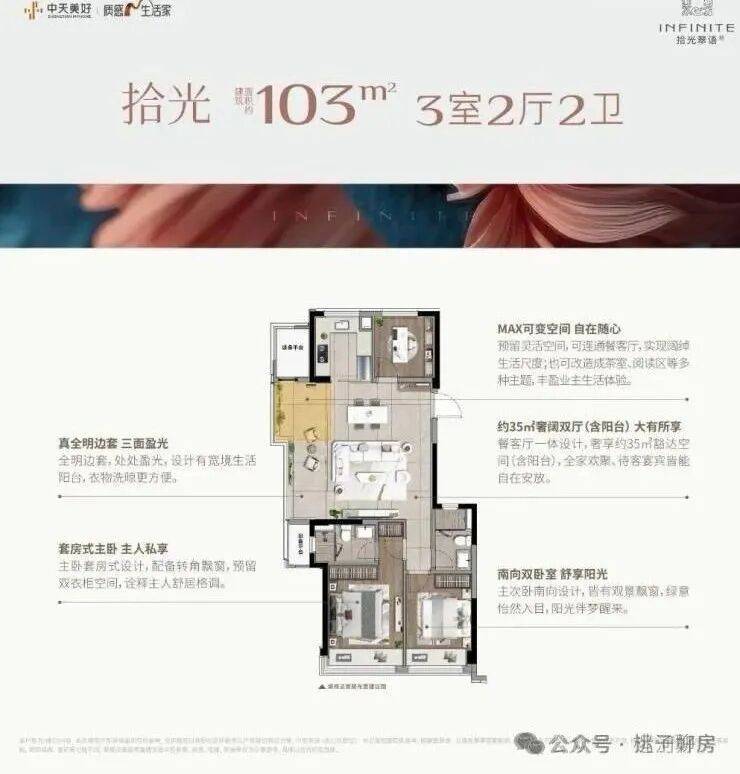 建面约103㎡的边套更是堪称神迹,将小户型的空间魔法玩到了极致。客厅到阳台的地面、天花直接拉通,甚至两侧的墙垛都已隐身,整个餐客厅面积达到约35㎡(含阳台),这可是140㎡以上大宅才有的空间感!