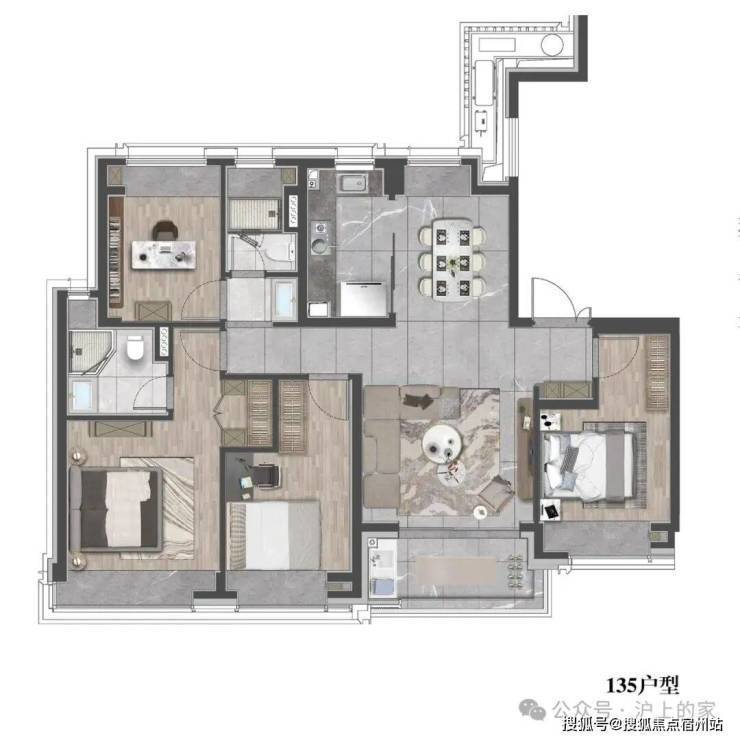 该户型贴合当代人居生活习惯,既适合三口之家小太阳家庭,也可以是三代同堂,每个人都能拥有独立空间。