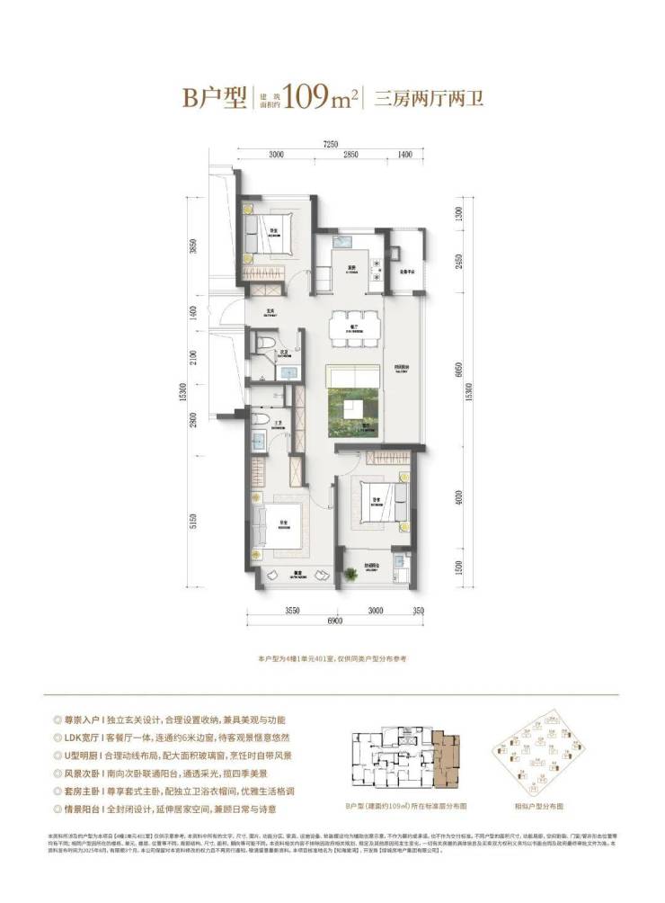 109㎡(3 房 2 卫):纯边套、三面采光、6.05 米横厅、主卧 16.4㎡、舒适度拉满