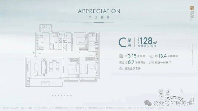 2. 四开间朝南的设计,南向面宽约13.4米,整个户型方正气派