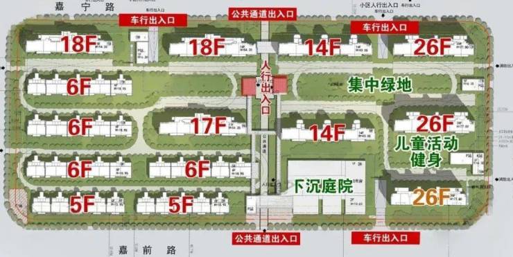 根据公示图显示,该项目的4个小板块最高层为项目东南角和西北角的26层高层,共有6栋,高度接近地块限高的80米(77.80米);18层的共有8栋;17层共有6栋;14层共有4栋;13层共有2栋;6层的共有4栋;5层的共有8栋。