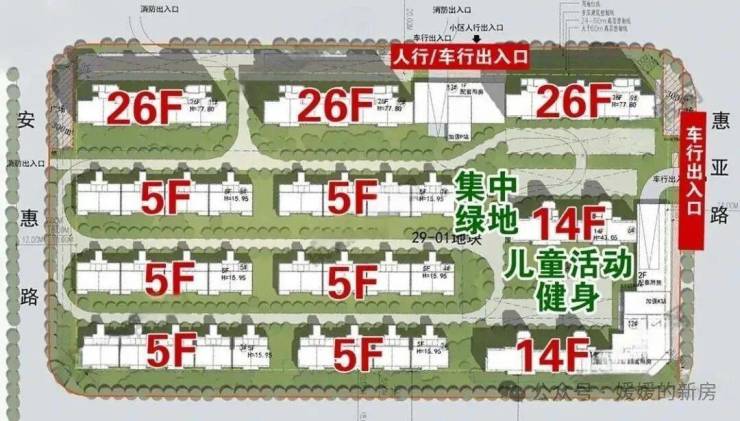 29-01地块原设计方案,将北面人行/车行的出入口向西侧的安惠路方向进行了调整,并疑似将北面的主入口调整到了惠亚路一侧。