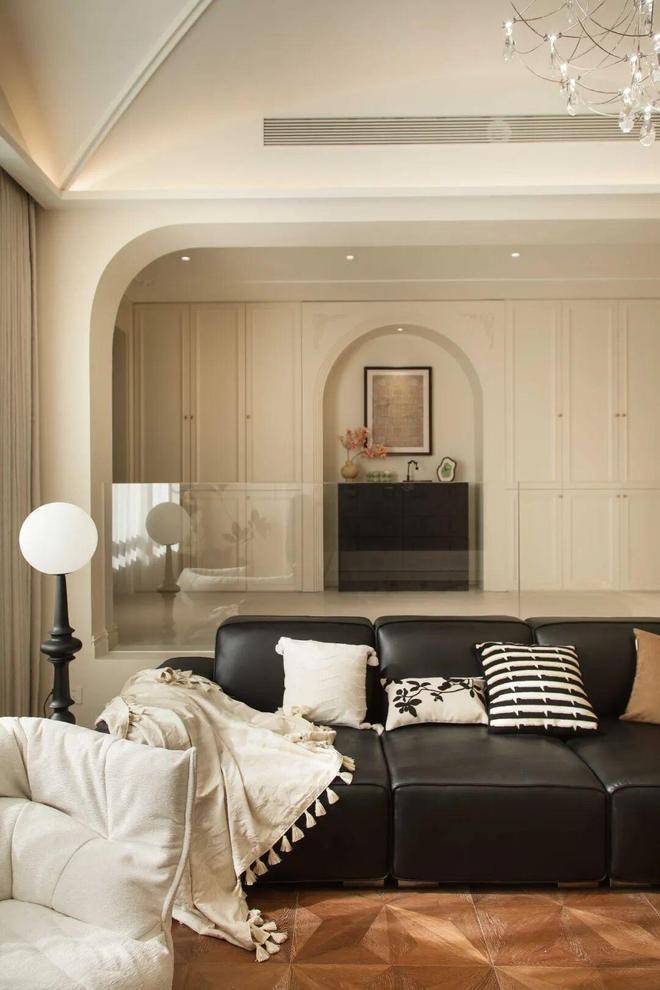 大面积落地窗搭配轻盈的纱帘,自然光线倾泻而入,让空间通透敞亮;一旁的黑色皮质沙发搭配柔软抱枕,与白色软装形成经典撞色,既保留法式的优雅,又融入现代家居的松弛感。