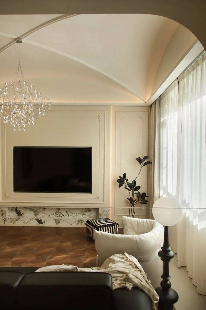 中央悬挂的水晶吊灯是空间的视觉焦点,晶莹剔透的水晶折射出柔和光线,与墙面的白色护墙板+大理石拼接装饰相得益彰,柔化了空间轮廓,增添精致感。