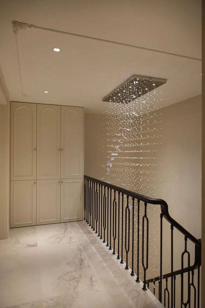楼梯区域的黑色铁艺栏杆+弧形台阶设计,成为空间的点睛之笔,既保障安全,又延续法式的精致线条,上下楼梯的每一步,都仿佛行走在法式生活的画卷中。