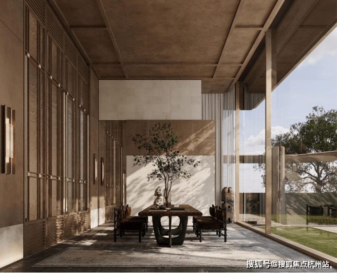 “回归之境”以3500㎡下沉水苑为核心 ,汇聚会客、泳池、茶室等多功能空间,形成仪式感十足的社区舞台。