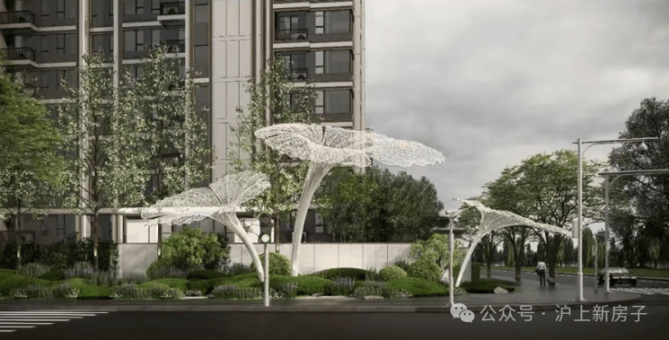 连廊绿化:以奉贤“公园城市”的理念为原点,结合街角绿化与单元门屋顶景观,创新打造立体的景观界面,使连廊成为一道绿色的风景。