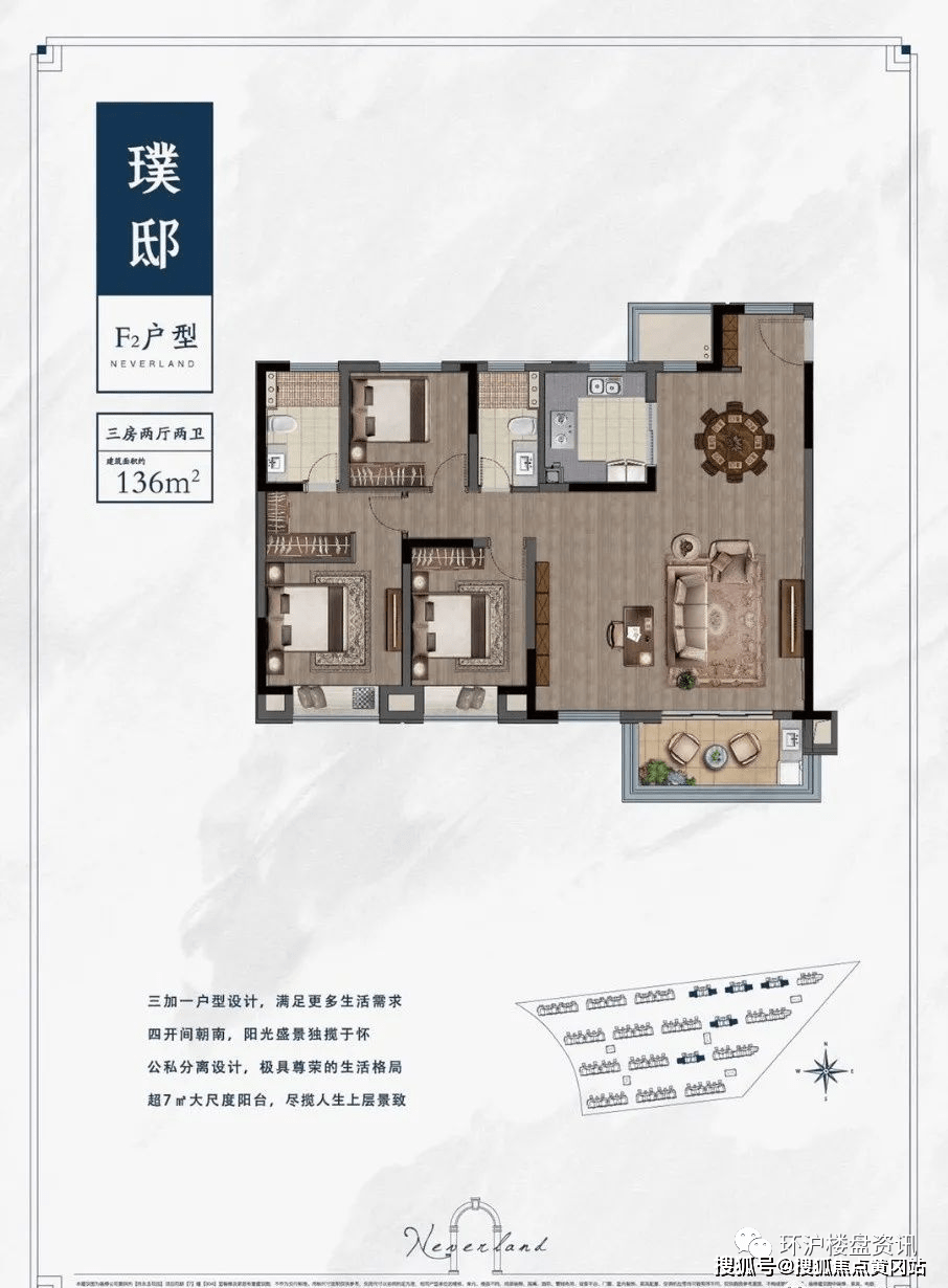 110㎡的三房两厅,相比上两个户型来的更为方正,三开间朝南,套房主卧带衣帽架,次卧难得拥有大阳台,采光效果可谓一流!