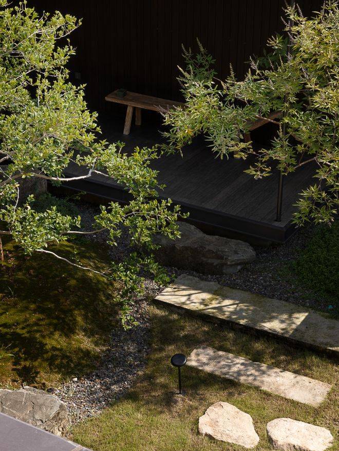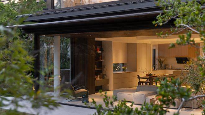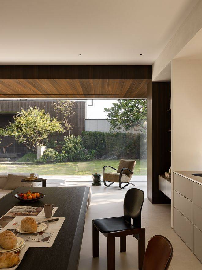 玄关作为“起”的一个过渡空间。一侧的采光天井让光影和绿色形成一幅活的框景,让人一入门便卸下尘世喧嚣。玄关的转折后便进入了豁然开朗的公共区域,客厅、餐厅、厨房一体化的设计。这里承载了家庭生活的核心,朝南近10米宽的大落地玻璃窗,让整个花园的景色映入眼帘。