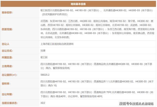 上海虹口弘安里售楼处电话➡:400-9939-964虹口区北外滩hk240B-02地块,用地面积3402方,容积率3.5,总建面11907方,出让价5.66亿,楼面价47554元/㎡,限高50米。