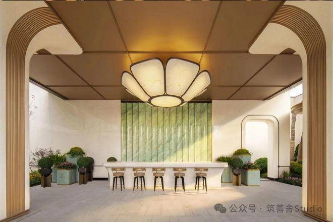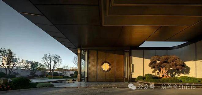 望潮洋房地块主大门气势恢宏,长达50米,高约10米,巧妙融合庑殿金顶与斗拱元素,并精选宝格丽金奢石点缀其间,既灵动飘逸,又尽显东方气派。檐角流淌的光影,交织着石材的温润与金属的微光,悄然印刻在景墙之侧。“望潮”之名,由此而生。步履踏阶,足尖轻碎的光斑,抬眼望处,檐下静谧的风,皆是园林的序章——不事张扬,唯以“藏锋”之姿,为低密住区铺陈出内敛而厚重的底色。