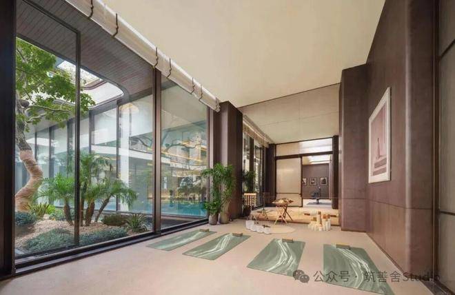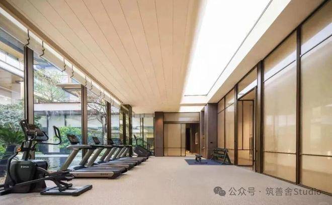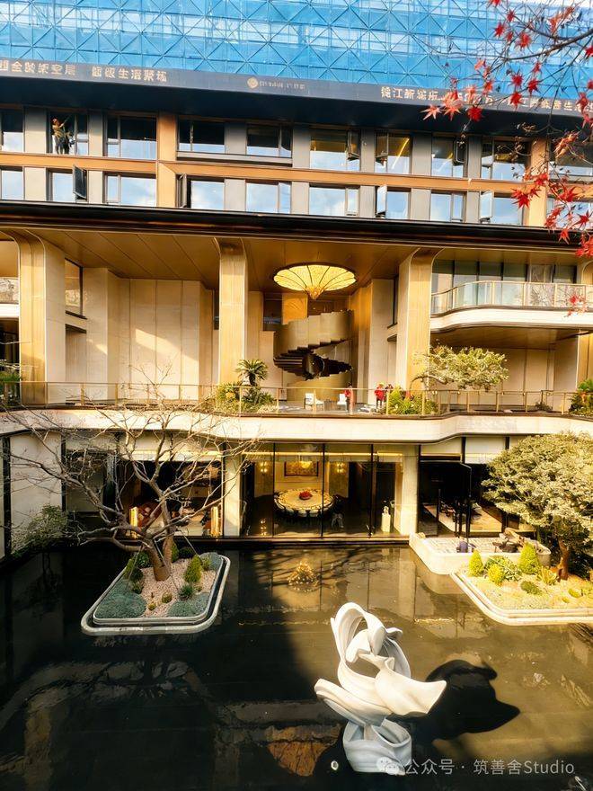 下沉庭院中水面如皱镜,倒映檐角、疏枝与银浪雕塑。水静默,将天光晕染成墨,风过处,涟漪轻触树影摇曳,是现代形意与传统水榭的静默对话。园中“空”境,皆浸于此汪柔水,裹挟江岸清润。精心构筑的园林,内部植满百年古木,营造出宛如现代的古典雅境。无论从哪个角度欣赏,都能沉浸于“诗中有画,画中有诗”的意境之中。