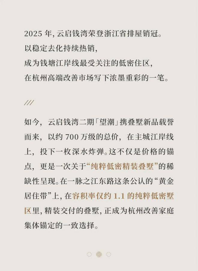 云启钱湾片区总规模逾50万方,二期望潮住宅占地约6万方,建面约15万方,容积率低至1.1,精心规划了251-335㎡江湾大宅、208-220㎡叠墅129-149㎡改善型小高层及108㎡的洋房户型,满足多元家庭居住需求。
