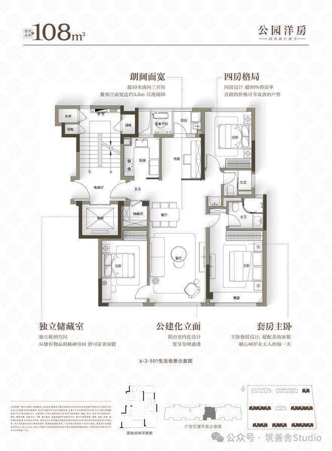最火爆的户型当属这个建筑面积约108平方米的户型,巧妙规划为4室1储藏间,集居住、收纳、休憩于一体,功能强大。三面朝南,面宽近10米,采光极佳;两个卫生间均设明窗,空间通透。一步到位的四房设计,南向主卧套房带飘窗,北次卧紧邻公卫,堪比类套房配置。三个卧室面积均超10平方米,即使是小卧室也能轻松容纳1.5米大床,贴心满足全家人的需求。