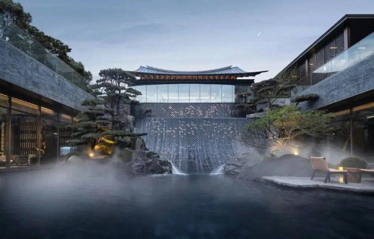 “天地院落”以超5米的鎏金龙鳞跌瀑为视觉焦点,黑松、羽毛枫与拙朴山石错落其间,构筑了一个充满禅意的美学空间。在这里,能瞬间从城市的喧嚣中抽离,感受“天人合一”的宁静。