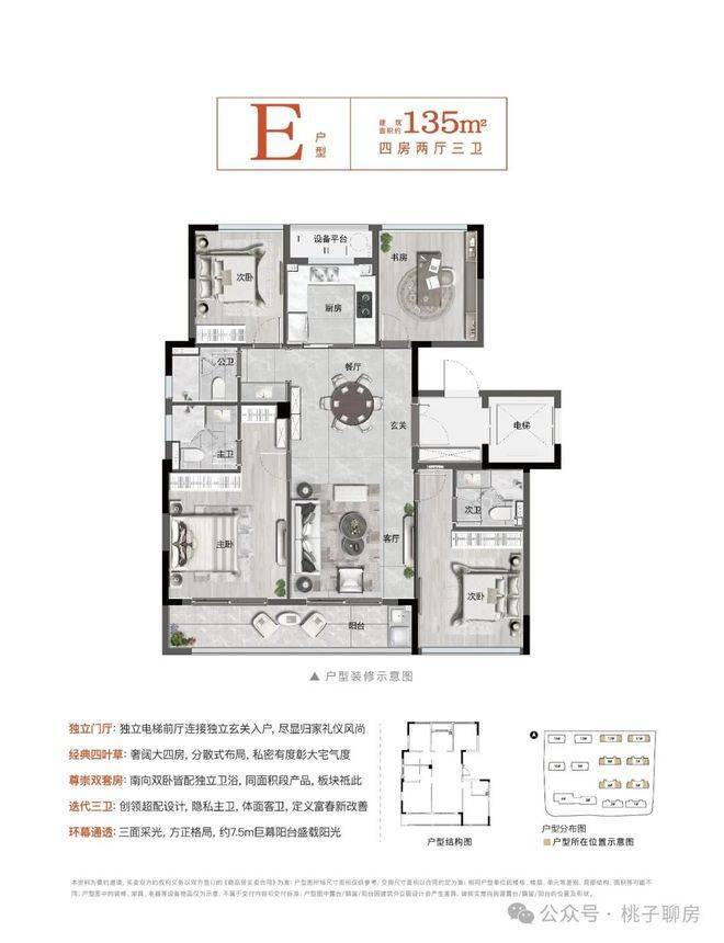 <臻贵> 祗此 140㎡内双套房:得房率超83%,带来超乎想象的尺度感,富春罕见,其中140㎡内户型,“1梯入户+2套房+3卫+大4房”尊崇设计,赶超市场165㎡