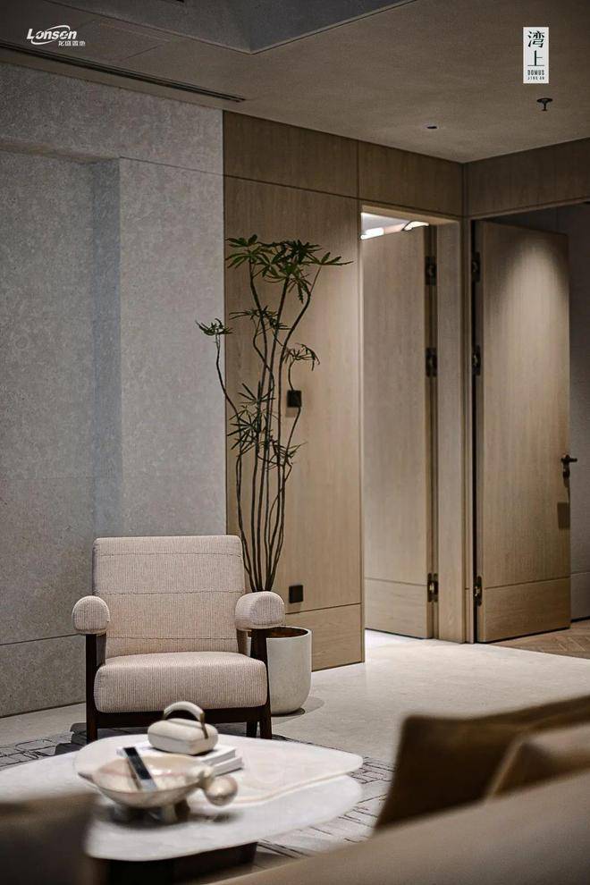 空间层高突破传统住宅达到约3.3米,搭配墙面、地面选用的米白色天然石材,以及顶部特殊的圆弧造型,通透的空间里蕴含着饱满的力量。