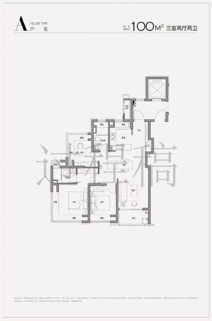 项目所有百平米户型都把传统过道融入到了客餐厅中,餐客厅更方正,面积比同级大约6㎡。