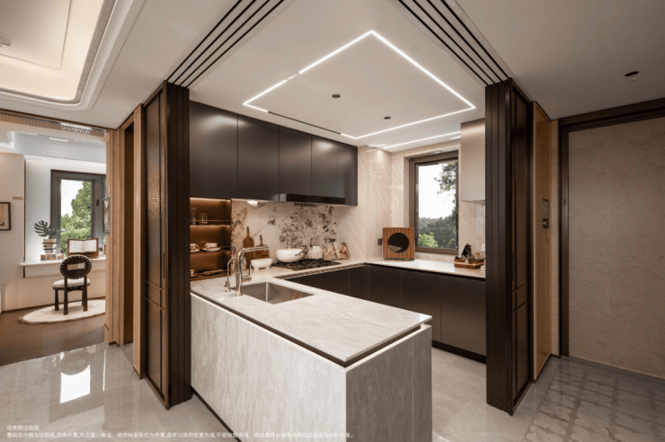 当半开放厨房与去过道设计结合,实现了LDKB一体化的场景串联,整个动线流畅无阻,家人在不同空间活动却不隔绝,孩子在客厅玩耍时,家长在厨房也能随时照看。