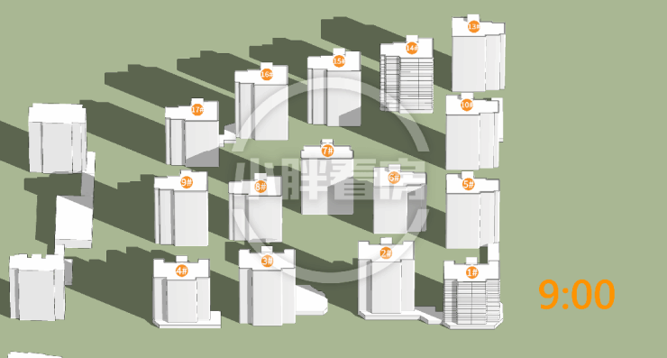 1#采光优异不存在遮挡。14#中低层受遮挡。就具体遮挡时间而言,14#主要在上午和下午受10#和7#遮挡。