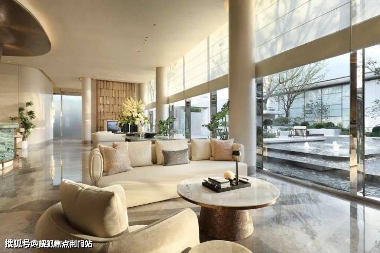 主入口大门高度达到了约7米,置身其中,尊贵气派。选用贝金米黄石材、维多利亚绿与白雪公主奢石,搭配古铜色金属板,巧妙融合冷暖色调,营造出极具张力的美学效果。
