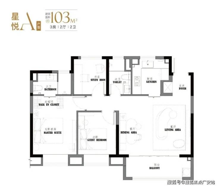 建面约107㎡户型 3房2厅2卫建面约107㎡整体布局与B户型基本一致,最明显的感觉是在尺度上进行了升级。比如横厅,由约5.3米升级至约5.5米,当然阳台和其他功能间也进行了相应的尺度升级。