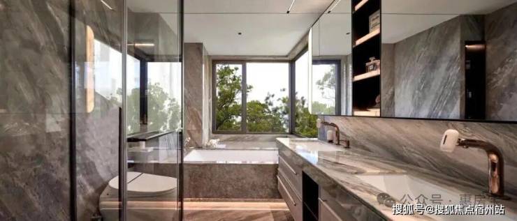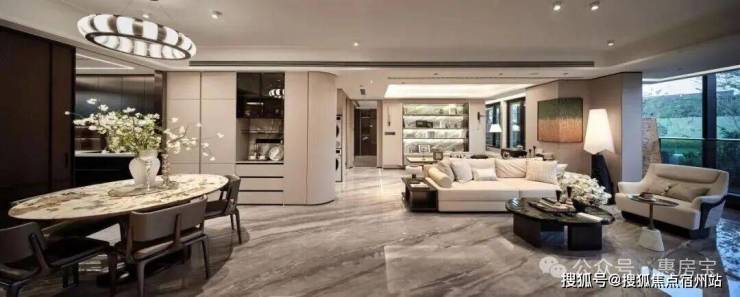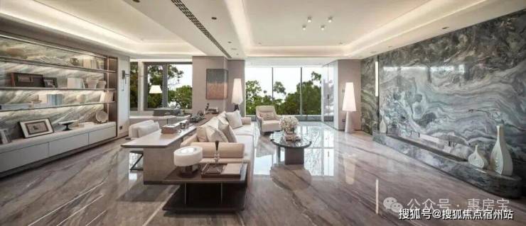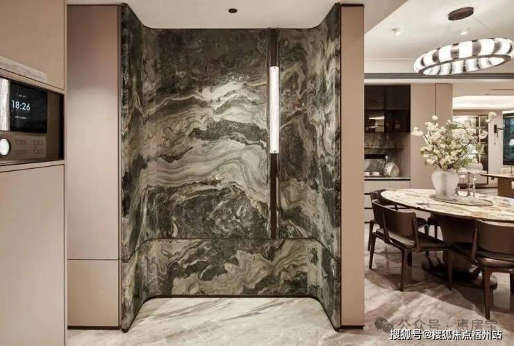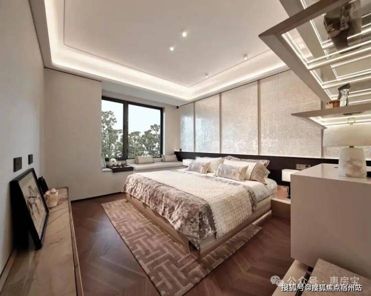 部分柜体更安全的圆角处理、高柜顶部一窥到底的镜面反光膜、大大提高空间利用的薄抽,不用弯腰一踢即开的踢脚抽设计,便利性大大增加。项目大量使用奢石设计,客厅四边弧形天花、主卧树叶拼花地板、精致优雅的骨骼线设计,都是开发商花费更大成本和耗材去呈现更美的视觉体验。
